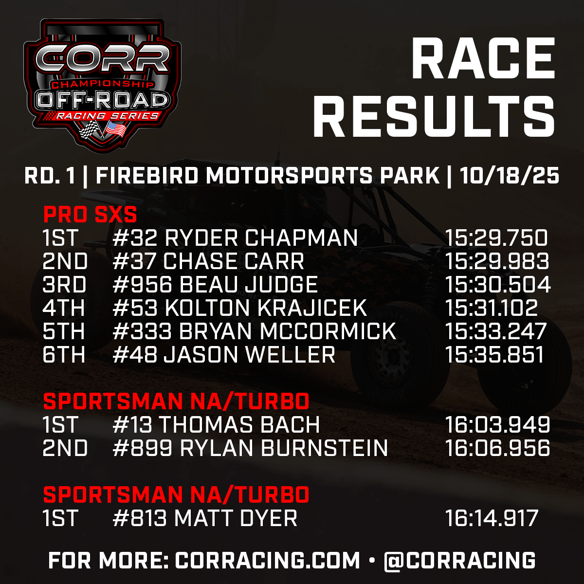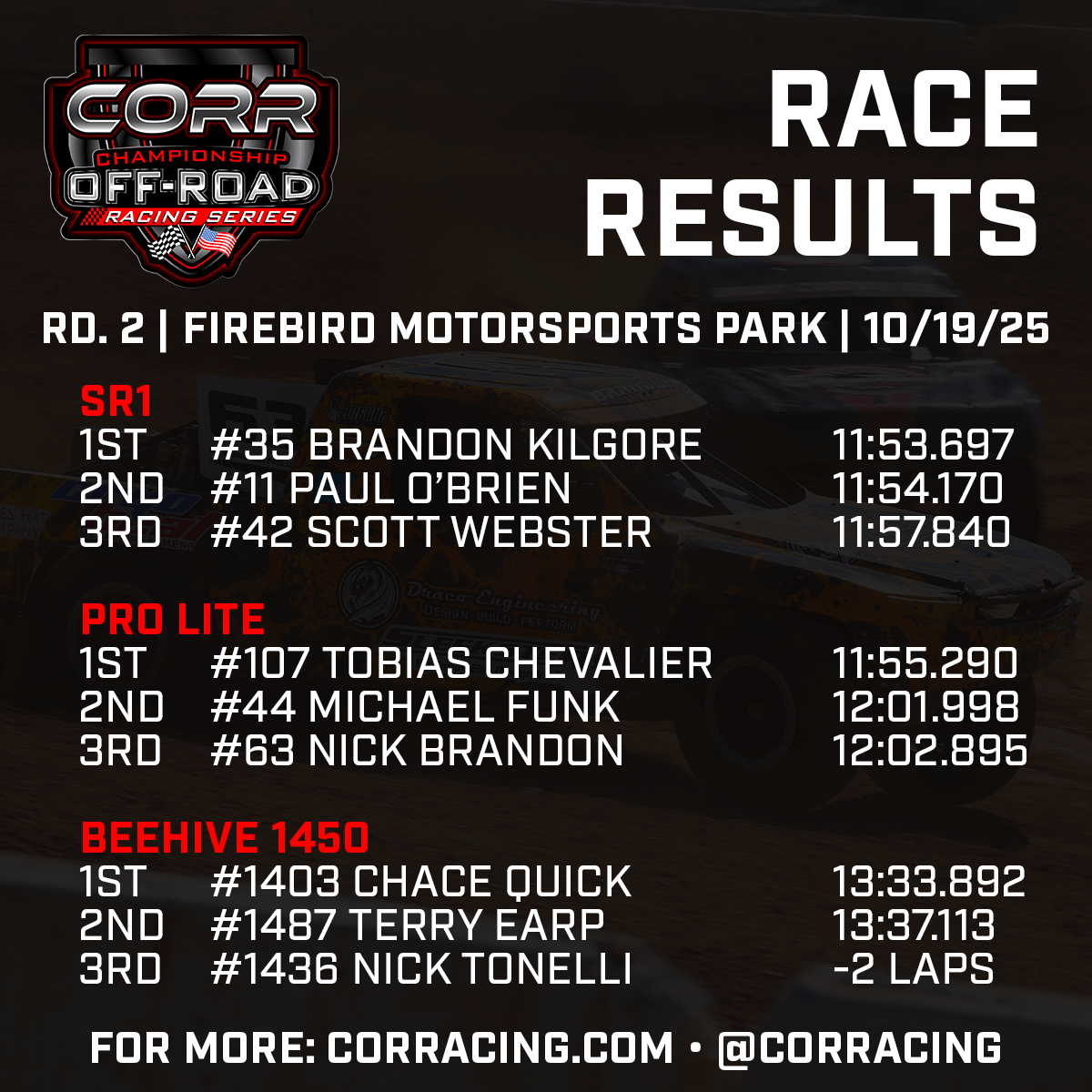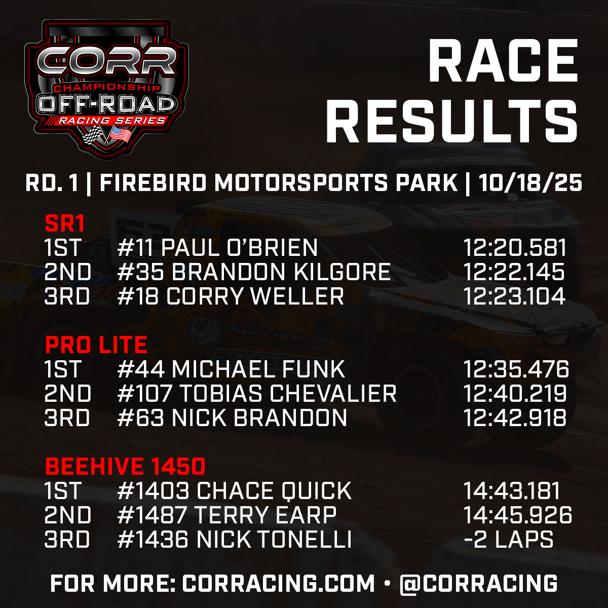 Double or nothing was the theme of the day at Firebird Motorsports Park on Sunday, as Championship Off-Road Racing (CORR) wrapped up its first of five doubleheaders on the 2025-26 campaign. Some racers managed to sweep their classes, and others would end the day wondering what might have been.