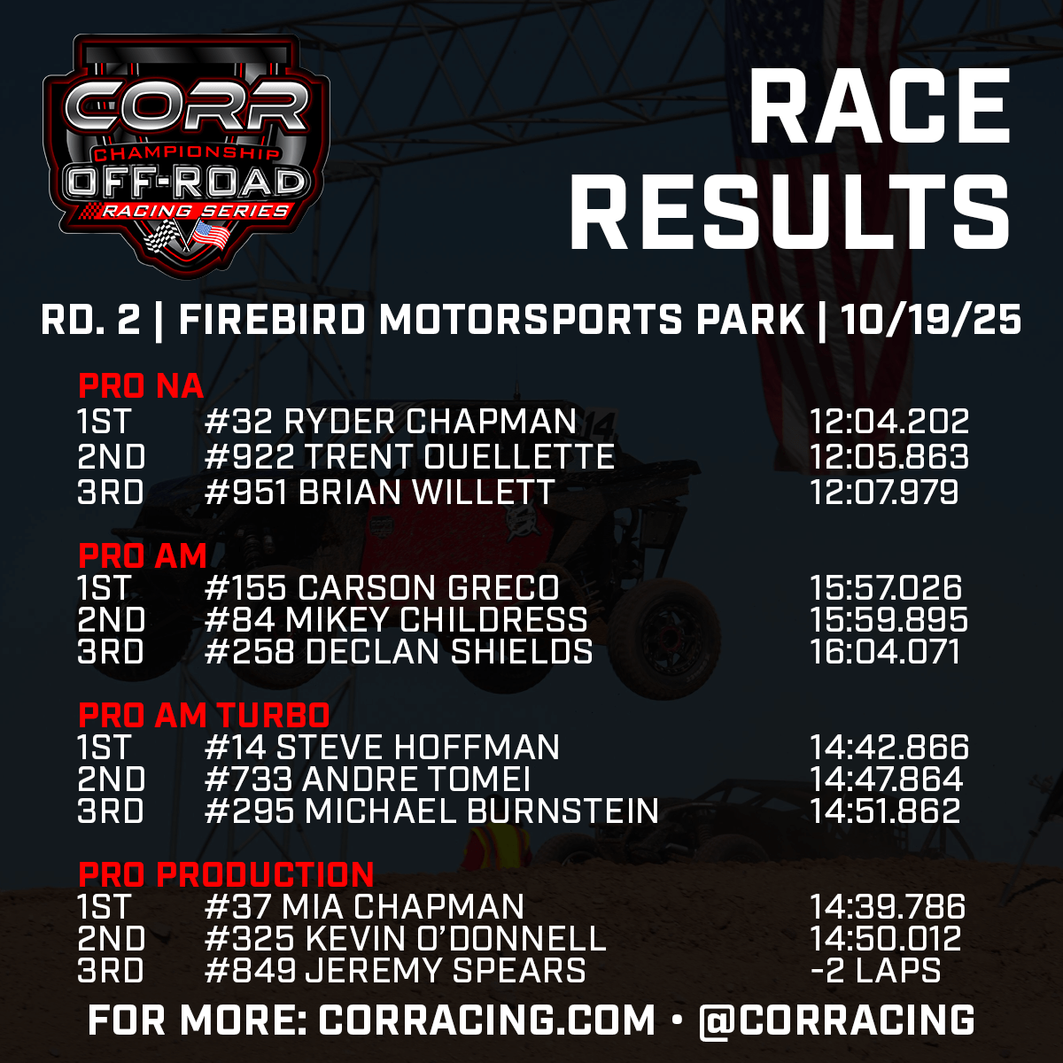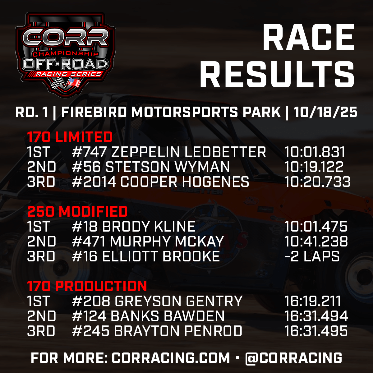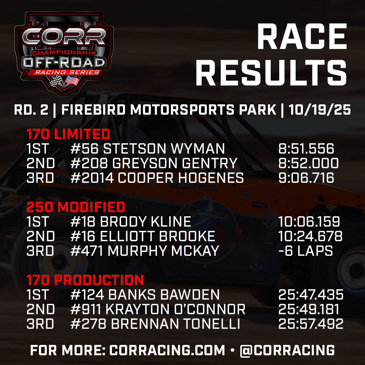 Podium finishers from CORR 2025-26 Round 2 at Firebird Motorsports Park were as follows: