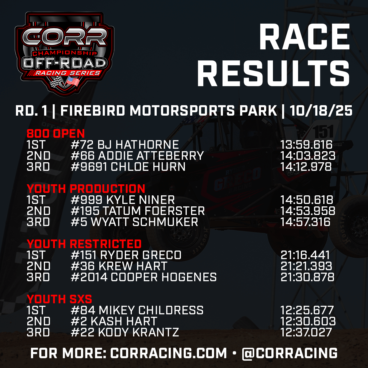 On-demand replays of this weekend’s free live streams remain available on CORR’s YouTube, Facebook, and Rumble channels. One-hour highlight shows of each race day will air on the RACER Network in the coming weeks.