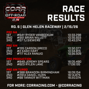 Podium finishers from CORR 2025-26 Round 6 at Glen Helen Raceway were as follows:
