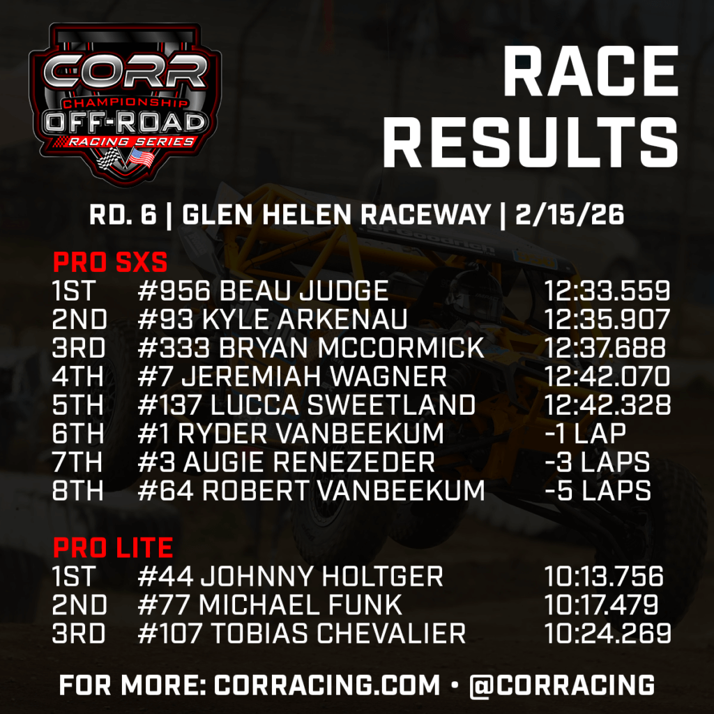 Championship Off-Road Racing (CORR) Pro SXS points leader Beau Judge finally scored his first win of the 2025-26 season on Sunday at Glen Helen Raceway. From the outside of the front row, Judge grabbed the lead from Saturday winner Augie Renezeder in turn one and never looked back.