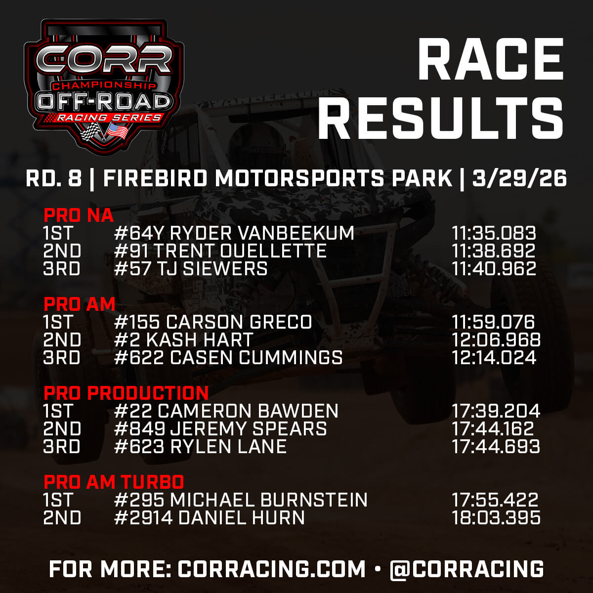 The action continues at 9AM on Sunday morning with another full slate of races for every class. Live streaming will once again be available on RACER+ and CORR social media channels.