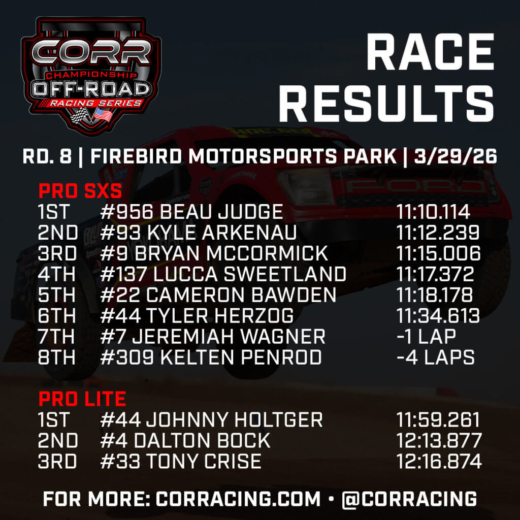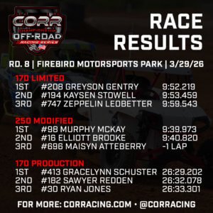 After taking his first podium of the Championship Off-Road Racing (CORR) season last month at Glen Helen Raceway, Conner Maxwell did a couple steps better on the box on Saturday afternoon at Firebird Motorsports Park. Maxwell took the lead early and scored his first victory of the season in Round 7, claiming the Maxxis Fastest Lap Award in the process.